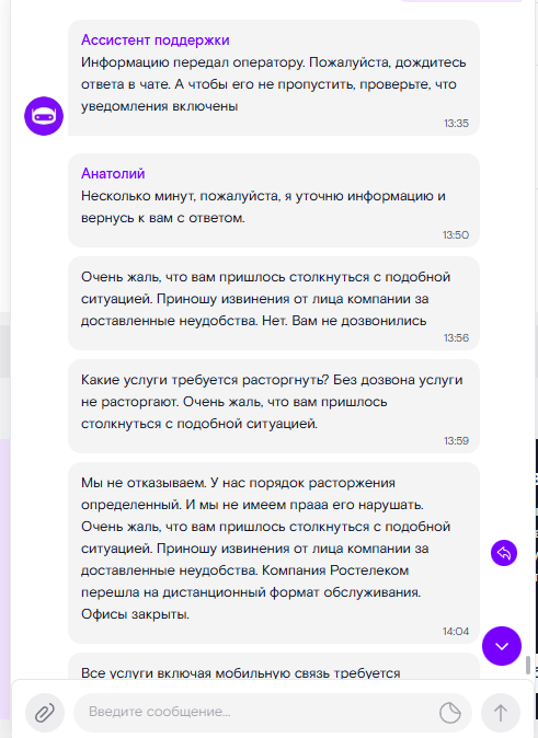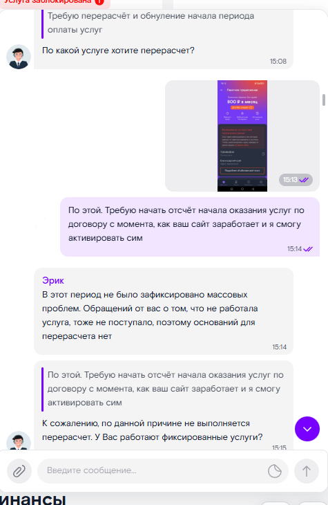 И требую перерасчёт, так как услуги по договору не оказываются по их вине, так как у них не работает сайт. Получаю ответ: Ааааще пох!
