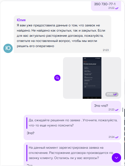 Пишу еще раз. Чо там по заявке? Другой оператор отвечает, что в работе и сегодня будет исполнена.