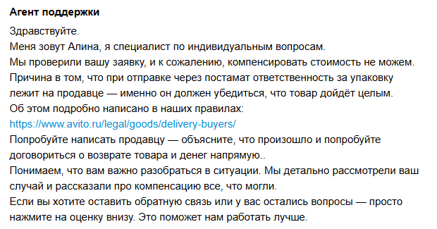 Думаю, ладно, я тоже продавец на Авито и понимаю, что, отправляя товар, рискую, и ответственность по продаже на мне, покупатель не может отвечать за косяк или ошибки доставки. Поэтому пишу продавцу: "Будь честным, верни денежку, я же жертва, я не получил товар". Ну и, конечно же, здесь меня тоже послали на йух: