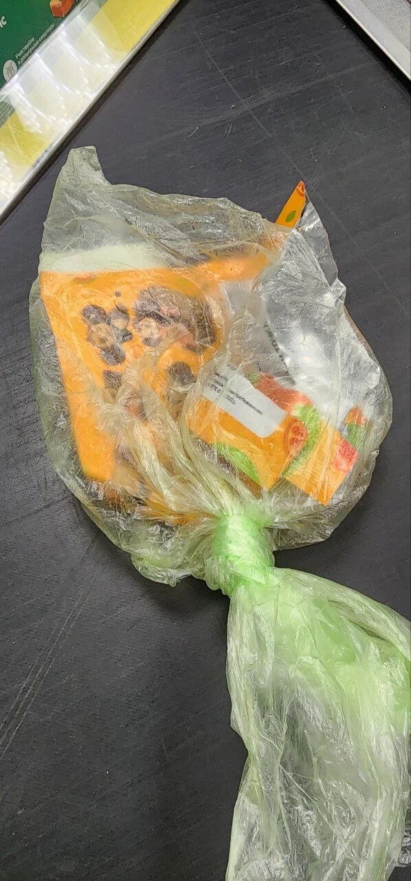 Да-да-да! Рваный прозрачный пакет из Пятёрочки, в котором ничего нет. Жена конечно же устроила скандал, но кассиры развели руками, сказав, что ничего не знают и принимают доставку без проверки!