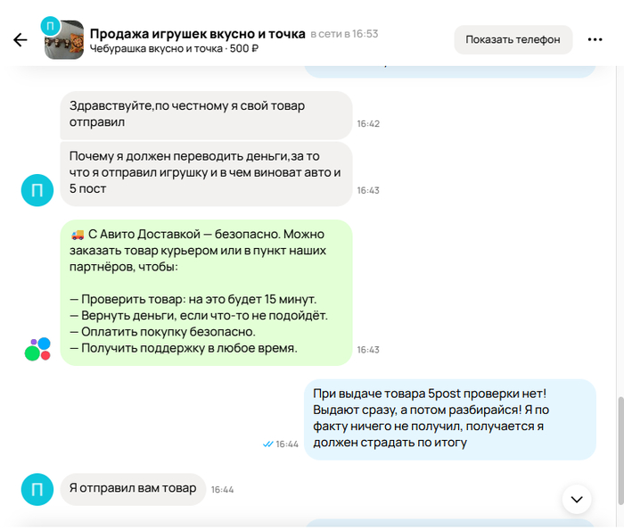Естественно, я сразу пишу в ТП Авито, что вот товар не пришёл, вот фото и видео упаковки у кассы, верните мне денежку назад, поскольку я жертва и не получил желаемого!