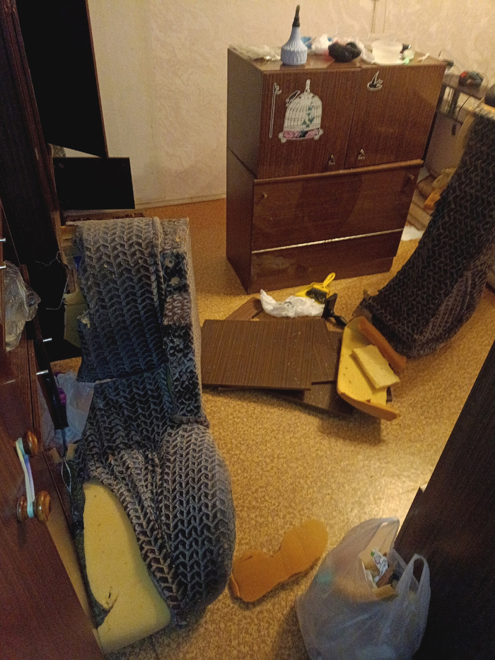 Снова остаюсь одна, окончательно разбираю шкаф и сервант. Обои, лишившись их поддержки, отваливаются почти самостоятельно.