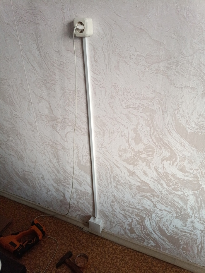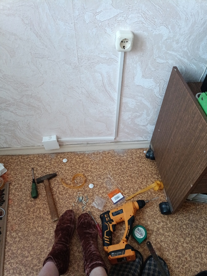 Провод от розетки решила не штробить в стене, а приютить в кабель-канале. Штробить — пыльно, прятать в канал - бюджетно. Получилось… в стиле "зато быстро"!