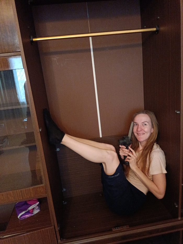Парень помогает сдвинуть второй шкаф (этот шкаф пока живой, но, кажется, он уже молится). Подметаю под ним, и внезапно появляется пол! Он там был всё это время.