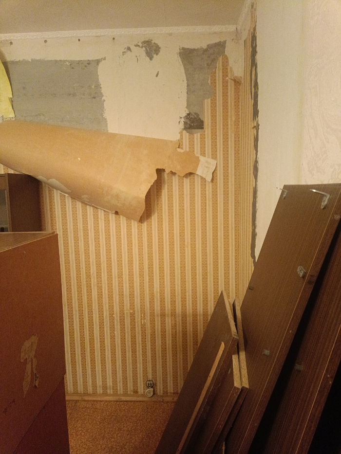 Далее — медитативный процесс сдирания оставшихся обоев. Кое-где они прицеплены к стене крепче, чем фанатка к кумиру). Размачиваю водой, счищаю шпателем.