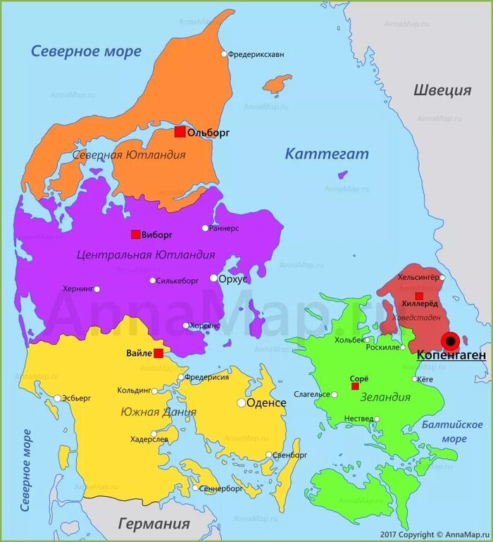 Коричневым: Дания-Норвегия; зеленым: Швеция; желтым: области Емтланд, Харьедален, Идре и Серна, балтийские острова Готланд и Эзель, которые перешли к Швеции; красным: провинция Халланд, которую датчане уступили шведам на 30 лет