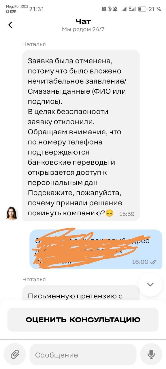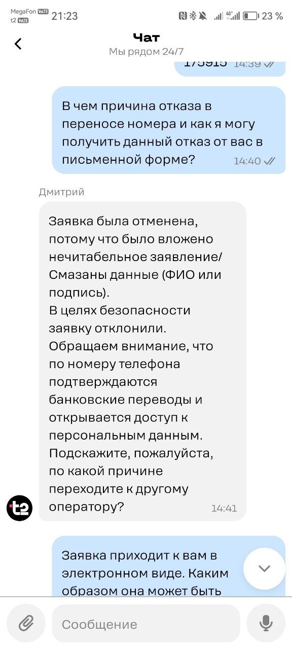 На следующий день от Теле2 пришел отказ, без объяснения причин. Дозвонился в поддержку Т2 - диалог вообще не складывался, на мои вопросы не отвечали, постоянно спрашивая зачем я перехожу, предлагали новые условия и т.д. в итоге отправили в чат, проявив настойчивость я узнал что причина отказа в службе безопасности, которой не нравится моя подпись и руководствуясь заботой обо мне они решили отказать.