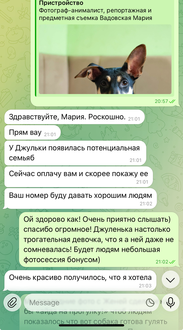 В целом, меня все устраивало, на тот момент я задумалась основательно здесь остаться, оплатить продвижение, выйти в топ просмотров. Последний запрос был от куратора по пристройству трех собак. С такого заказа я взяла стоимость чисто символическую, покрыть затраты на поездку и купить своим собакам вкусняшек. Собаки на пристройство - это отдельный уровень. У них нет сумасшедшей выдержки как у домашних, некоторые могут откровенно бояться, прятаться от камеры. Мы долго обсуждали с заказчиком съемку, они покупали милые одежки, чтоб собаки мило выглядели в кадре. А я, поняв из разговора, что со светом там все очень плохо купила дополнительно световое оборудование. Переписка началась на самом авито, и позже мы переместились в телеграмм. Я так делала и до этого, отзывы с тех заказов модерацию прошли.