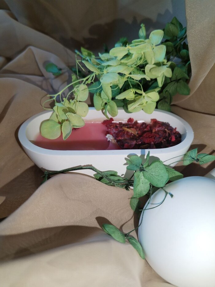С учётом того, что дизайн был выбран максимально простой, я решила добавить уюта и мягкости строгим линиям гипса, поэтому при помощи очень мелкой наждачной бумаги внешняя сторона формы и крышки были тщательно обработаны до матовой бархатистости, и даже плюшевости, от чего материал стал даже более тёплым на ощупь. Цвет свечи был выбран молочным, а украшением подобран нежно розовый восковой цветок (собственного изготовления☝️🤣). Аромат: ТАБАК И ВАНИЛЬ