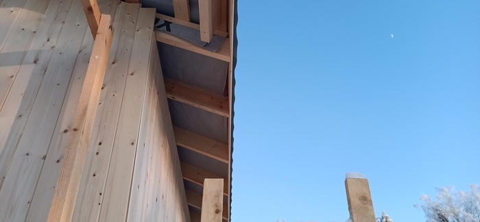 Понравилось исполнение фронтонного выноса. Набили чурбачков на обрешётку, потом навесят на них лобовые доски, потом подшиву сделают и будут удивляться - а почему это у нас кровлю выпучило под этим весом? А потому, что чурбачки надо пришивать и к отделке фасада, если решил рукожопить и не хочешь делать фронтонную лесенку.
