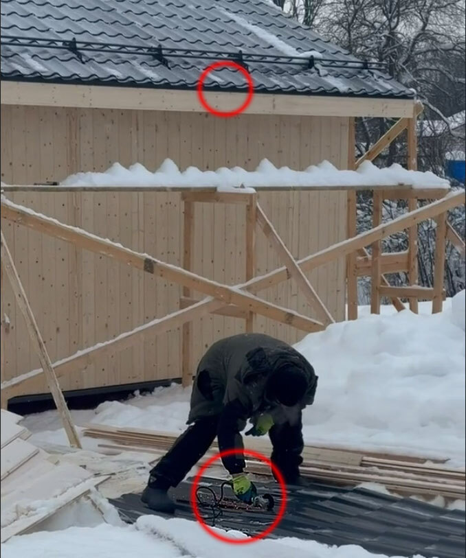 Если кратко, коллега прислал видео с объекта, где строитель пилил металлочерепицу болгаркой прямо на глазах восхищённого заказчика. На фото в большом кружочке видно, как безобразнорабочий старательно искрит болгаркой. Сейчас расскажу про большой кружочек, но вы запомните и про маленький - там тоже видно кое-что.