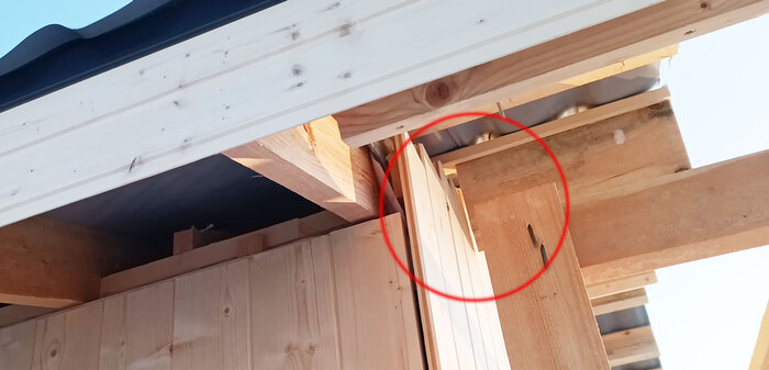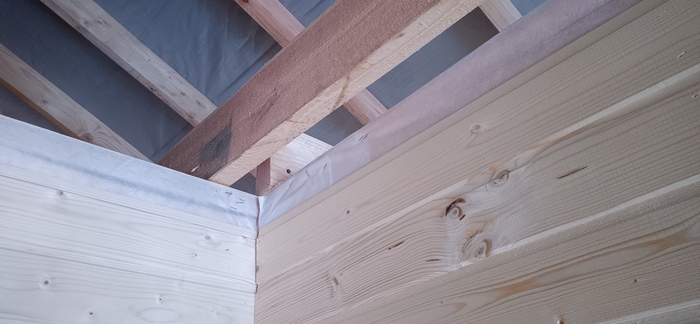 В принципе, всё ясно. Но это ещё не полный финал. Смотрим стык пароизоляции стен с потолком. Тут понятно - также нет закладных, пароизоляция без проклейки, а места для нахлёста не оставлено. Постойте... а почему там продольная лага не соприкасается с поперечной?