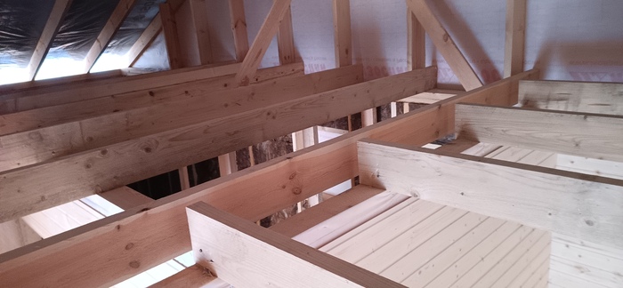 Полез я посмотреть на перекрытие чердака. А его и нет... просто лаги брошены на верхнюю обвязку каркаса. При этом, они могли бы работать в качестве затяжек для висячих стропил, но те, кто назвался строителями этого объекта, решили, что это лишнее.