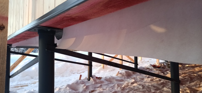 На месте все опасения подтвердились. Ветрозащита перекрытия свисала тряпкой, крепили её снаружи, а не уложили изнутри на обвязку. Это не ужас, но будет дуть.
