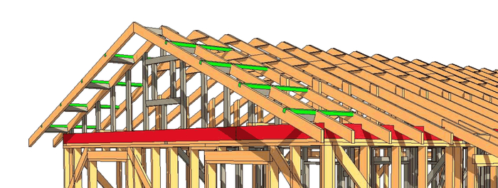 Скажете, что опять непонятное говорю и не показываю как надо. В идеале, надо вот так - фронтонные стропила вынесены на брусках, которые опираются на фронтонные стропила и связаны со следующими после них стропилами. Выполненная поверх обрешётка дополнительно свяжет конструкцию, но не будет основным несущим элементом.