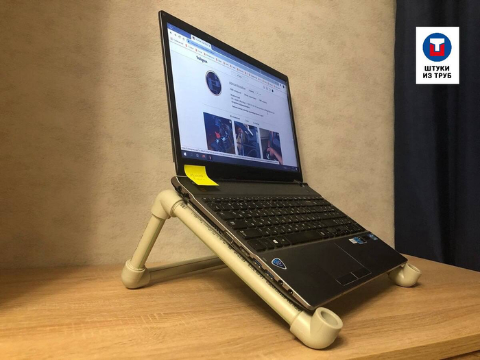 Когда-то сделал вот такую подставку из пластиковых труб для ноутбука. Вдруг кому-то пригодится идея. Размеры не даю, поскольку делать нужно под конкретный ноутбук, а они все разные.