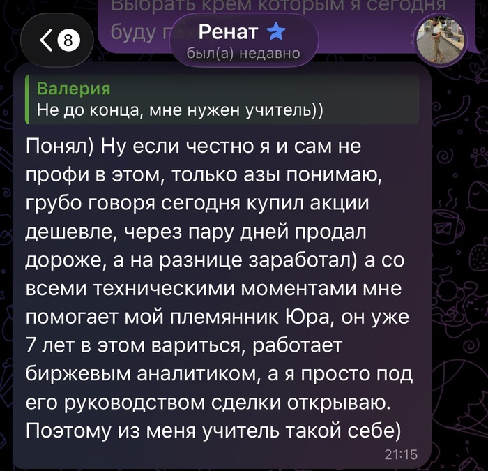 Ну, думаю, может реально что то важное, или решил поинтересоваться моим переездом в другой город. Отвечаю ему что то логично-нейтральное и сразу без паузы от него приходит: