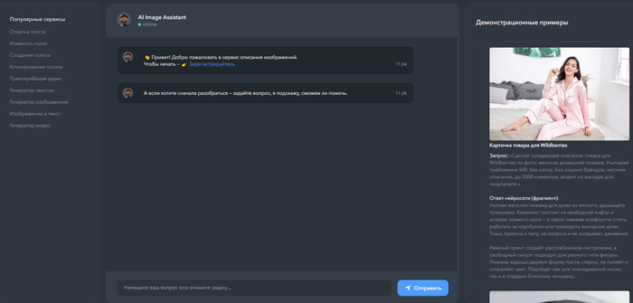 Пишу задачу обычными словами (например, «сделайте подробное описание картинки для карточки товара») — и сервис предлагает подходящий вариант из своей коллекции, это удобно. Заходит, когда нужно несколько версий: короткая подпись, более детальный текст и отдельно список ключевых деталей, чтобы ничего не забыть. Главная особенность для меня — это не один инструмент, а “витрина” ботов: можно подобрать стиль и глубину описания под конкретную задачу, не бегая по разным сервисам.