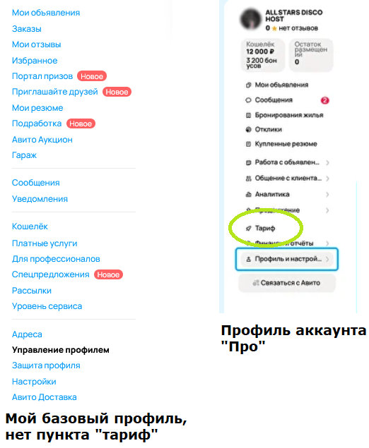 Обратите внимание на этот момент, в аккаунте "Про" появляется вкладка тарифы, в то время как на базовом аккаунте такой вкладки нет: