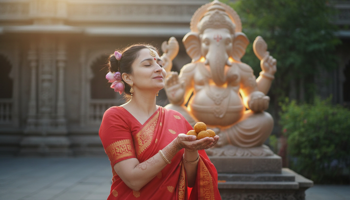 Используя это фото как основу, сохрани точные черты лица девушки-йогини, тёплый золотистый свет, она в оранжево-терракотовом индийском платье (курта + леггинсы) с тонким шарфом-дупаттой, сидит на коврике в простой удобной позе со скрещёнными ногами, перед ней на низком столике яркая статуэтка Ганеши и цветы, ракурс фронтальный по пояс с лёгким наклоном сверху, мимика мягкая, доброжелательная, глаза смотрят вниз на статуэтку, ладони сложены в намасте на уровне груди, несколько лепестков на её коленях, реалистичное фото премиум, 8K.