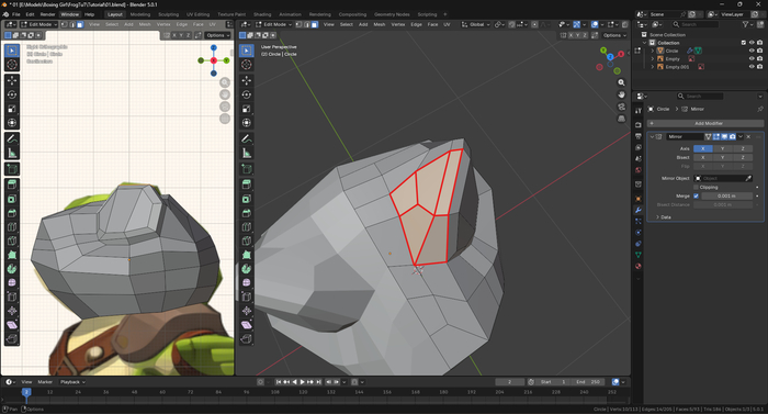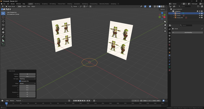 1. Добавляем два референсных изображения на сцену, сбрасываем вращение (Alt + R) и размещаем. Создаем (Shift + A > Mesh > Circle) кольцо и задаем ему 8 вершин (Vertices). Удаляем две боковые вершины и применяем модификатор Mirror (F3 > Mirror) или как я показывал ранее.