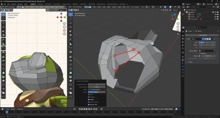 5. Разделяем полигоны через (Ctrl + R + Вращения колесика), создавая 2 новые грани в области носа и 1 новое кольцо граней между шеей и ртом.