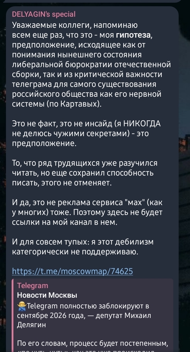 Заместитель председателя Комитета Госдумы по экономической политике Михаил Делягинсообщил, что Telegram планируют полностью заблокировать по аналогичной схеме, как это произошло с YouTube. Блокировка, согласно заявлению депутата, запланирована на сентябрь 2026 года, совпадающий с выборами.