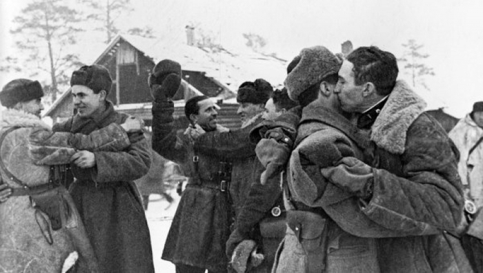 Женщина поздравляет солдата с полным снятием блокады. Объявление в левой части экрана - приказ командующего войсками Ленинградского фронта генерала армии Леонида Говорова о полном снятии блокады Ленинграда.