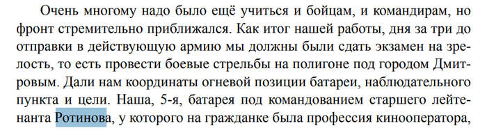 Из книги:«...батарея под командованием старшего лейтенанта Ротинова, у которого на гражданке была профессия кинооператора».