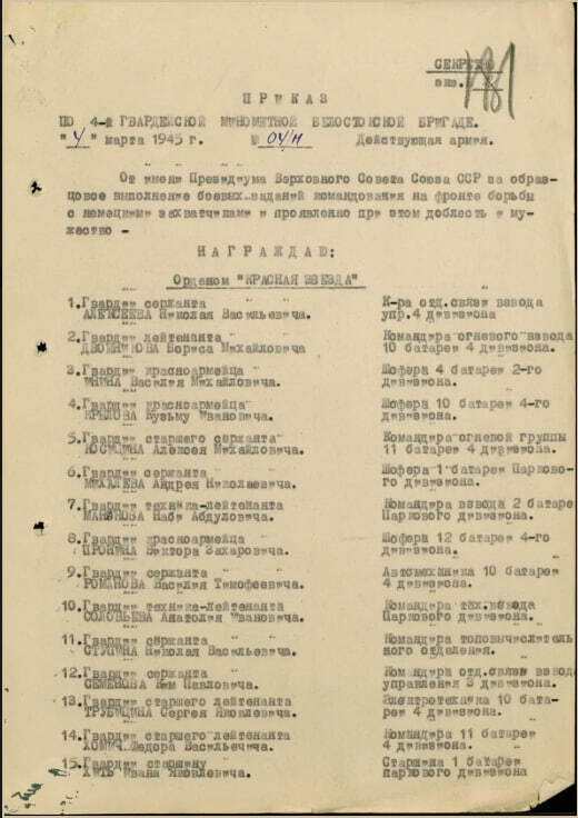 Что добавил архив («Подвиг народа»): Наградные листы. Орден Красной Звезды (1943) — он, комсорг полка, под огнём восстанавливал связь. Орден Отечественной войны (1945) — он уже командир батареи, умело громил врага в Восточной Пруссии.