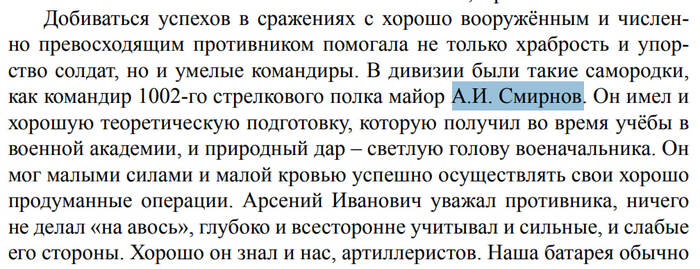 Из книги: Командира 1002-го полка майора А.И. Смирнова называли самородком. «Светлая голова военачальника... мог малыми силами и малой кровью успешно осуществлять операции».