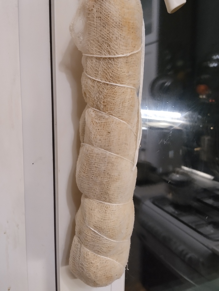 Далее вымачиваем в холодной воде сутки (воду меняем), можно двое суток на всякий. Обсушиваем мясо и обваливаем в смеси приправы, делаем мешочек из марли, мне хватает одного слоя и вешаем в то место, где есть движение воздуха ( у меня это балкон)
