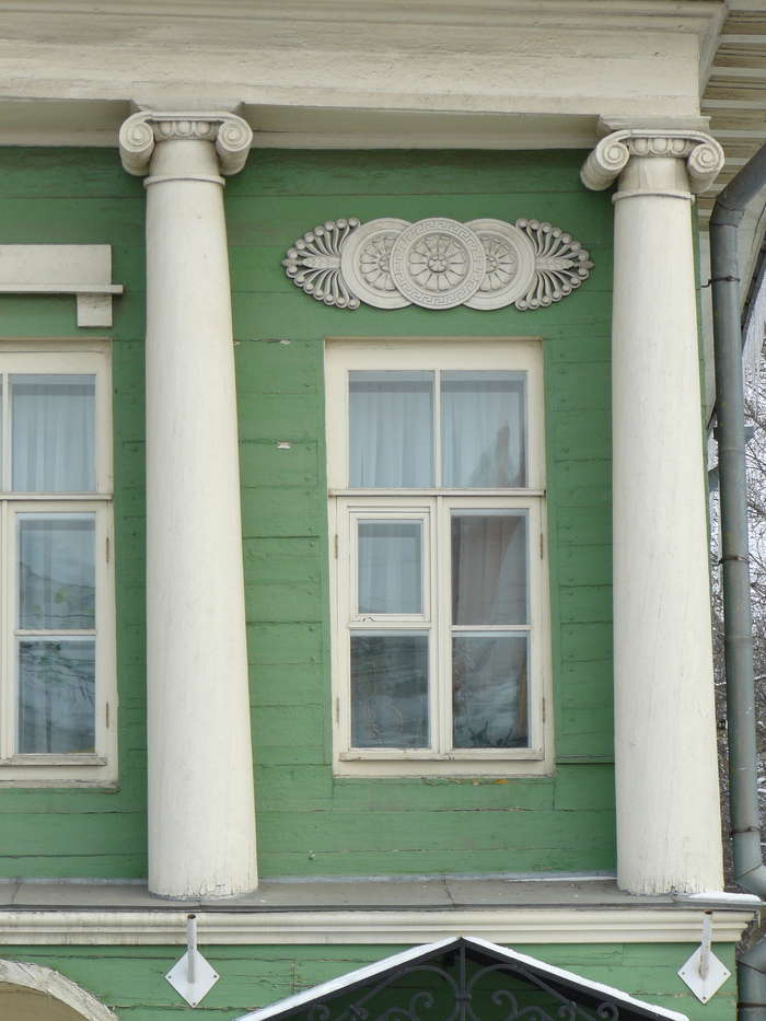Здание выполнено в стиле ампир, при этом деревянное оформление фасада стилизует приёмы, характерные для каменной архитектуры. Примечательная конструктивная особенность: массивные деревянные колонны выполняют не только декоративную, но и несущую функцию, опираются на фундамент здания. Большой вынос, венчающий карниз дома, украшен модульонами. Привлекает внимание и накладной рельефный резной деревянный декор. В тимпане когда-то был помещён большой герб Левашовых, окружённый намётом и ветвями дуба. Внутри арок первого этажа расположены небольшие окна в рамочных обрамлениях.