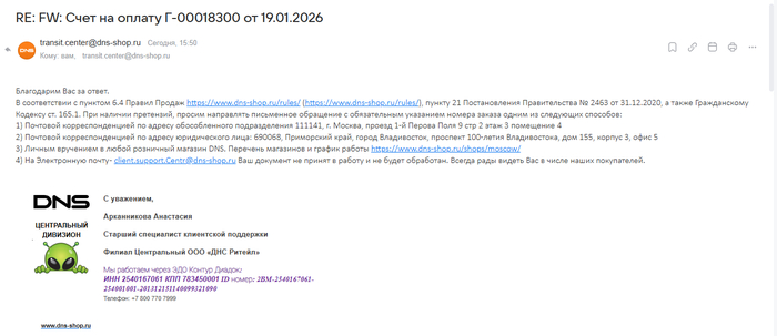 «Ваш документ не принят в работу и не будет обработан. При наличии претензий просим направлять письменное обращение: 1) почтой во Владивосток на юр адрес, 2) почтой в Москву в их офис, 3) лично принести в любой магазин DNS».
