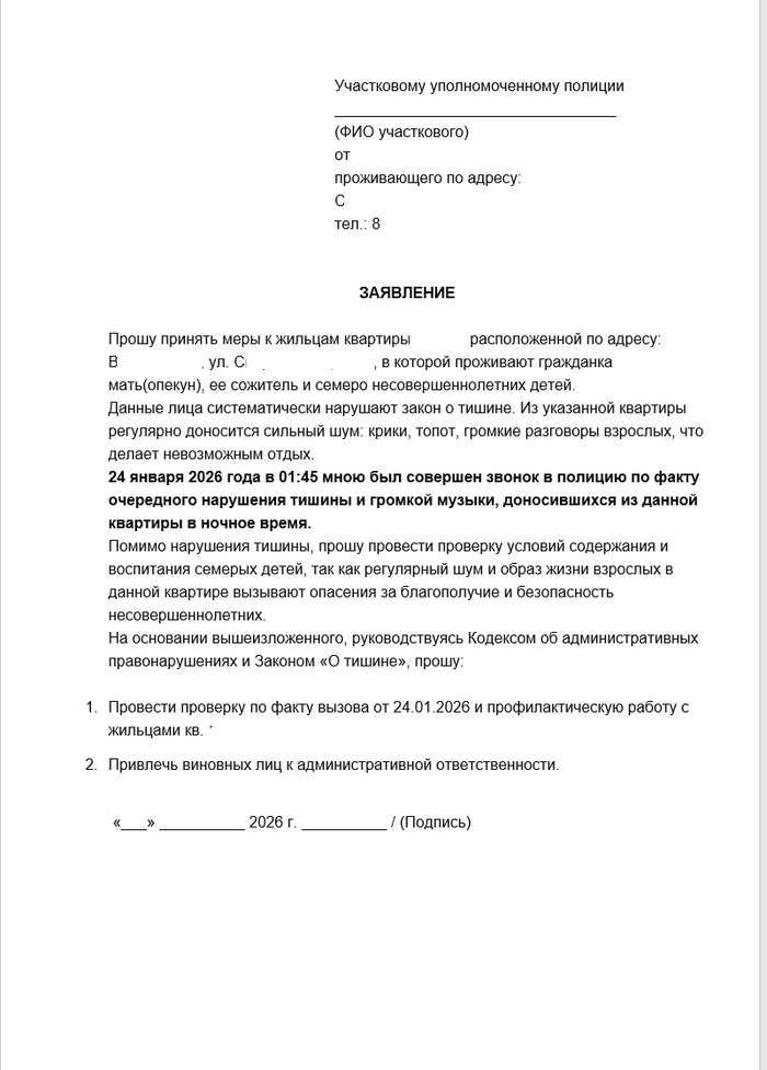 Суть обращения: Подробно объяснил ситуацию — систематическое нарушение тишины, игнорирование просьб, наличие в моей квартире пятимесячного ребенка, который не может спать.