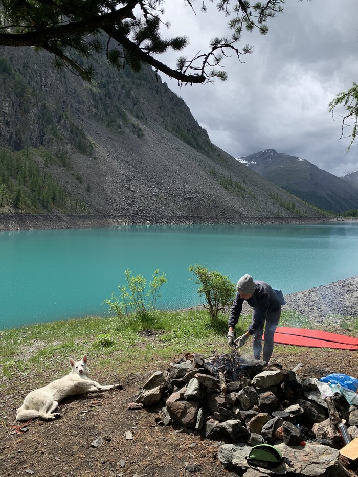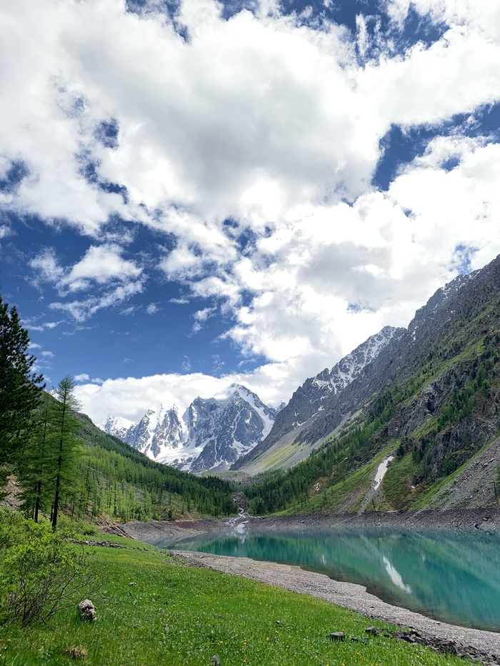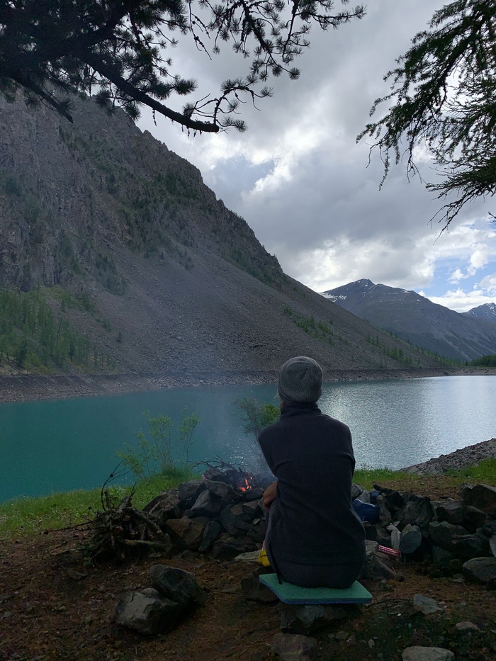 Сказать, что его вид меня потряс — ничего не сказать. Когда до похода я смотрела на фото — думала, что цвет озера преувеличен фильтрами. Но оказалось, что он такой и есть — пронзительно-бирюзовый, насыщенный. Такое безумное яркое пятно посреди этой суровой природы. А на заднем фоне — заснеженные горы: Мечта, Сказка и Красавица. Я смотрела на эту картину и думала: это самое красивое, что я когда-либо видела в жизни.