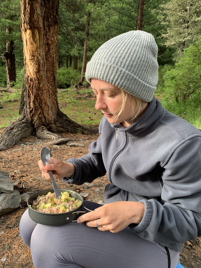 Устроили роскошный ужин: отварили картошку, открыли консервированного тунца. Заправили картошку солью, растительным маслом и диким луком, который рос неподалёку.