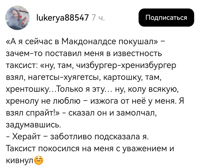 Обсуждали с коллегами кому в каких заведениях кухня нравится. Я рассказал, что любим с женой ужинать в "Павлине-Мавлине" недалеко от дома. А еще похвалил ресторан с морепродуктами "Сибас-Ловелас", в который заходили в Коломне. Коллега: "В Крошку-Картошку сходи, тебе должно понравиться".