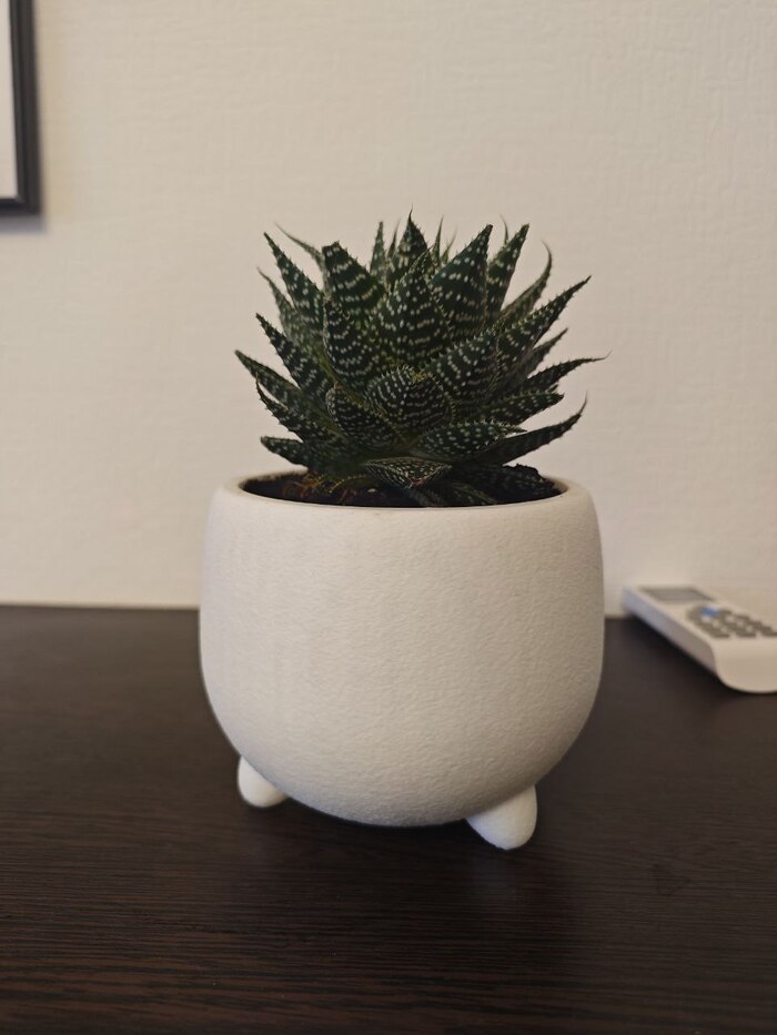 На новый год мне подарили алоэ остистое (Aloe aristata) и я решил что такому суккуленту нужно особенное кашпо. Пока висел в онлайн-чате друзьями играющими в Warhammer, замоделил такой горшочек. Контраст межу тяжелой формой и маленькими ножками, поднимающими конструкцию над поверхностью, придал живости конструкции.
