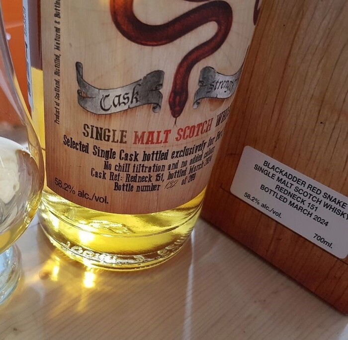 Blackadder Red Snake Single Malt (Single Cask), NAS (пишут, спирты до 10 лет), крепость - 58,2%, без колера, без фильтрации, бочка - (Redneck 151 - экс-бурбон первого наполнения), бутилирован - март 2024.