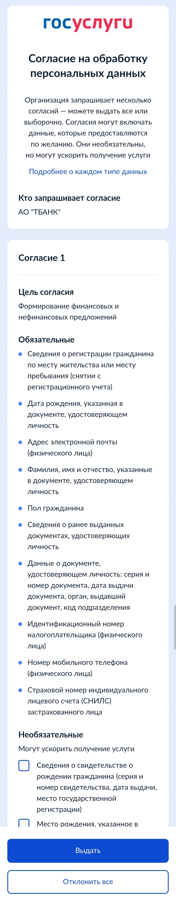 Пришёл запрос на обновление паспортных данных (45 стукнуло в прошлом году), офигительная опция у Т банка - обновить из госуслуг, тыкаю, получаю такой вот список )