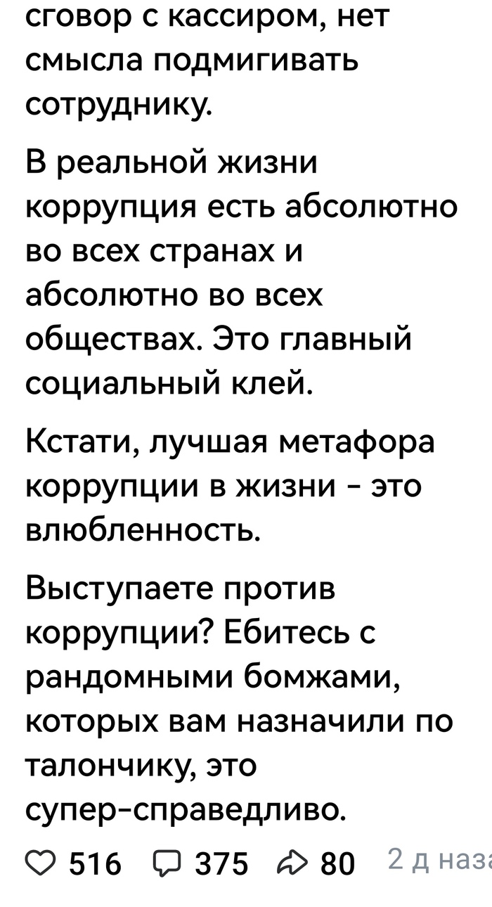 Капитализм целенаправленно развивает в людях их худшие стороны. Он поощряет жадность, индивидуализм, цинизм, равнодушие к чужой боли. Он учит воспринимать мир как рынок, а людей — как инструменты, ресурсы или препятствия. Даже дружба, творчество и любовь всё чаще оцениваются через призму выгоды, статуса и успешности. Человек становится товаром, который обязан себя «продавать», постоянно повышать свою «стоимость» и бояться обесценивания.
