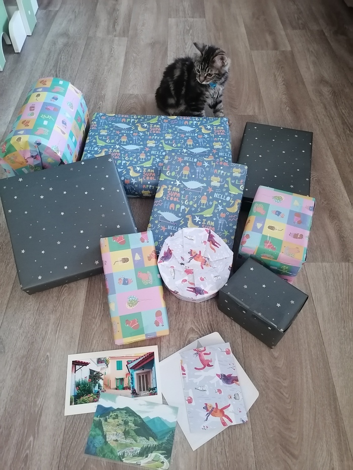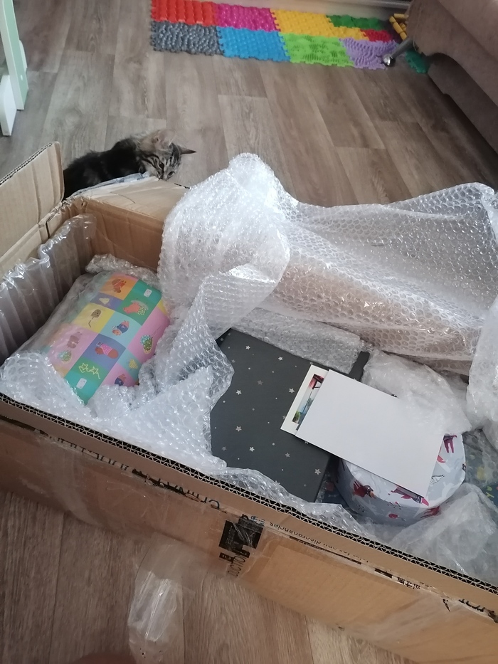 Так вот посылка получена. Муж дотащил её до дома, и сразу же забрав младшего (чтобы никто не отвлекал) и пока старших не было дома, отправил меня распоковывать подарок. Позднее это оказалось очень мудрым решением так как открыв посылку я поняла, что мне пришлось бы выстоять серьёзный бой с детьми за мои же подарки. (В процессе муж всё таки не выдержал и пришёл подсказывать какой свёрток открывать первым).