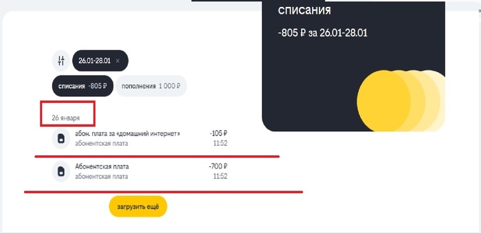 Домашний интернет - не подключен; Пакет на 200ГБ моб. интернета исчез. Хотя, как видно из скриншота оплаты - Билайн за домашний свои 105 рублей списал. И следующий платеж 25 февраля 2026 - уже 700 рублей, без интернета. Началась переписка с тех. поддержкой(долгая), дважды пришлось описать проблему. В итоге составили обращение и обещали, что мне позвонят на следующий день к 10.