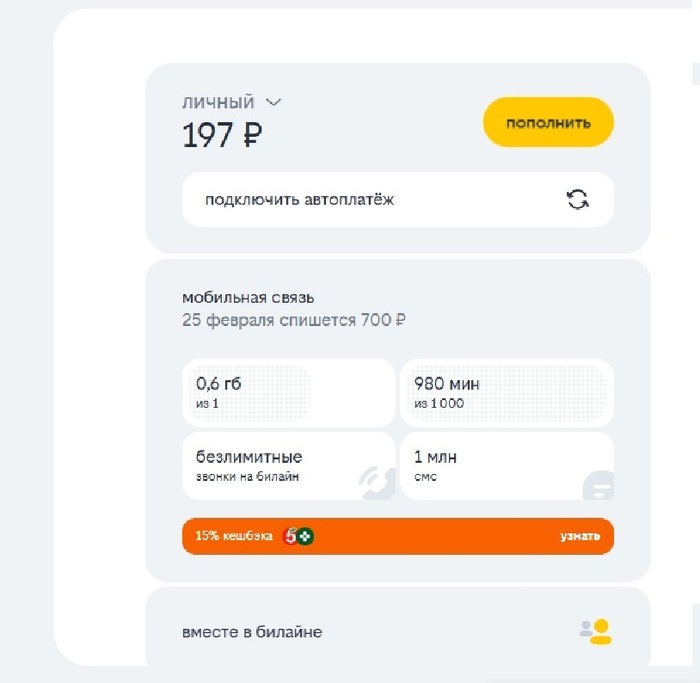 700 за мобильную связь и 105 за интернет. Я возвращаюсь к просмотру измененного тарифа: 1000 минут, 1ГБ моб. интернета, также остался пакет 200ГБ мобильного интернета. Следующий платеж 25 февраля 2026 - 805 рублей. Я выдохнул, ну еще бы вместо 945 рублей в месяц выторговал 805 рублей. Тем же вечером дома, домашнего интернета нет! Все проверил, залез в личный кабинет Билайна, а там картина: