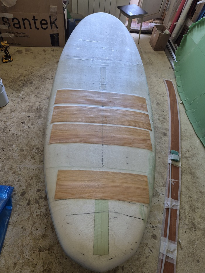 Далее, по тойже схеме, что и с дном нужно уложить ламинат стеклоткани .Для усиления места ,где будет стоять райдер решино уложить 0,6 мм сосновый шпон и дополнительный слой стеклоткани.