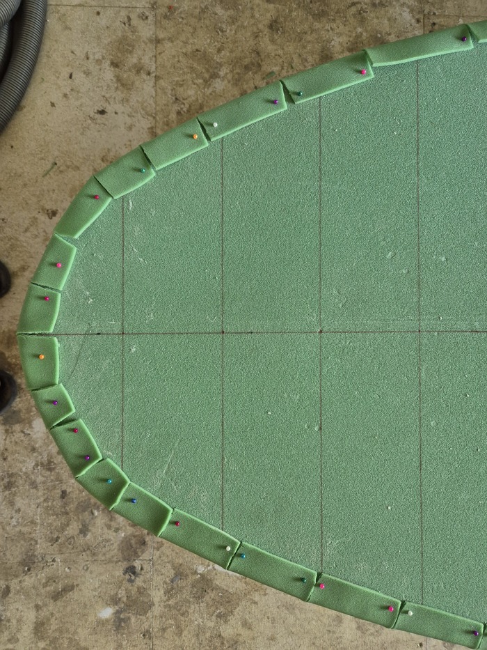 Форма доски готова и теперь необходимо покрыть палубу сендвич-скорлупой . Для этого использовал 3мм пвх .Это самая сложная часть работы . Форма палубы имеет очнь много криволинейных плоскостей, а на нее ужно натянуть плотный плоский лист пвх.Та еще задачка. для этого использовал строительный фен и сегментирование бортов. Грел феном, загибал края, фиксировал булавками.