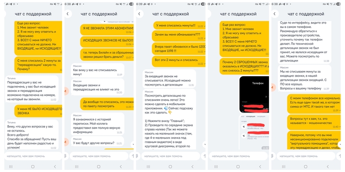 Я написала в чат оператору, которая ответила мне в духе "ну раз звонки есть в исходящих, значит вы этим абонентам звонили". На мой ответ, что крышка у меня все еще на месте, и я им сегодня не звонила, а только сбросила звонки - мне написали, что ну значит "минуты не списывались". Но они ОЧЕНЬ ДАЖЕ списывались, о чем я им и сообщила, приложив скрины. И здесь это наглядно. У меня сегодня ночью списался и обновился пакет, ровно 1200 минут, сегодня утром стало 1198. Как раз эти 2 минуты за СБРОШЕННЫЕ звонки и списались. Других звонков у меня пока не было. Это называется у них "минуты не списываются"🤬🤬🤬 В итоге, оператор выдал гениальную мысль, что это "я так вижу в своем телефоне и проблемы у меня с телефоном"...Ну ну.. Переписка ниже, свела в коллаж весь этот Билайновский маразм.