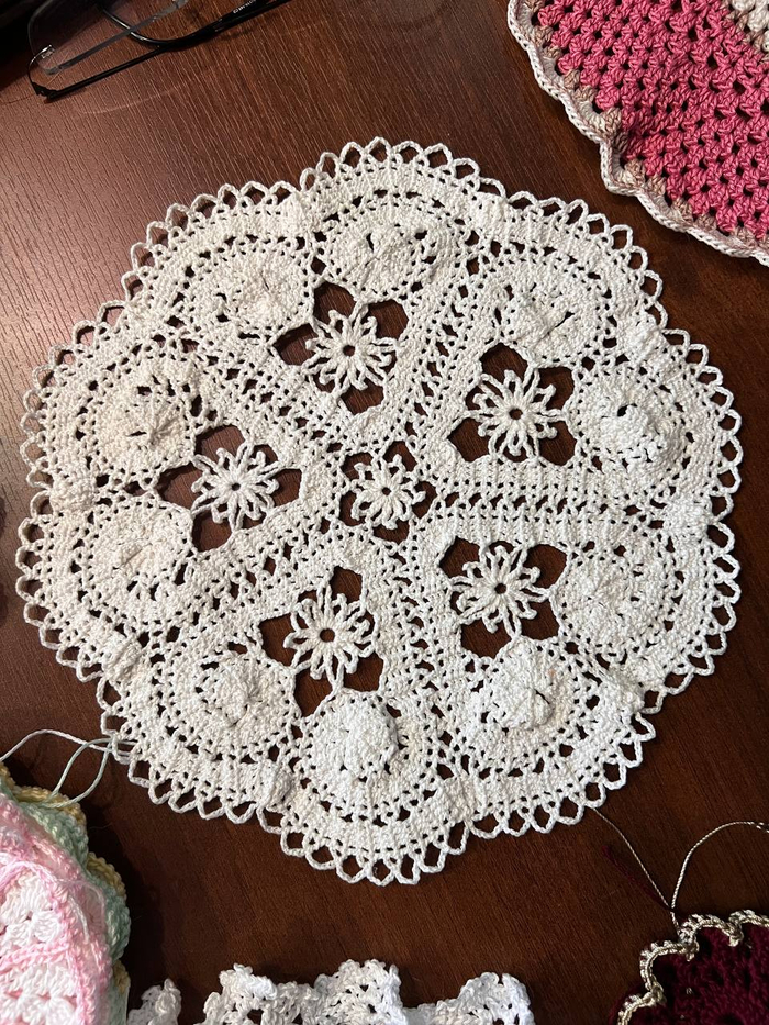 Сумки, вот такие декоративные пончики, салфетки, чехлы на телефон короче всякое кроме шмоток вяжет. Зачем? Говорит : "Вот задолбаюсь заниматься дизайном продавать буду") Но на самом деле просто для прикола и для спокойного медитативного процесса вечерком развлекается.