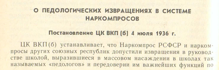 Постановление от 4 июля 1936 года осудило педологию за «ложно-научные эксперименты, бессмысленные анкеты и тесты», которые приводили к необоснованному отчислению детей из нормальных школ.